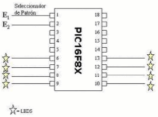El controlador tendrá dos entradas (E1, E2) y ocho salidas. Las ocho salidas estarán conectadas a 8 LED. De esta manera, controlando las ocho salidas, se puede elegir cuáles LED están encendidos y cuáles no.